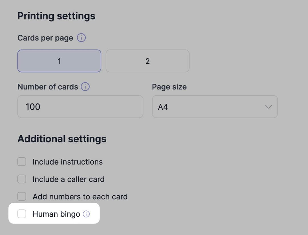 To help better facilitate a human bingo game, we're adding a space at the bottom of each square to write a person's name, just enable it when you go to print your card.