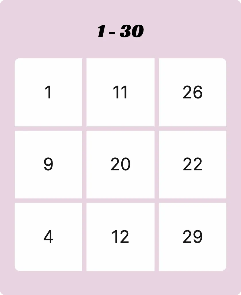| 30-Ball Bingo | 30 | 3x3 grid (9 numbers) | Full card (coverall) |