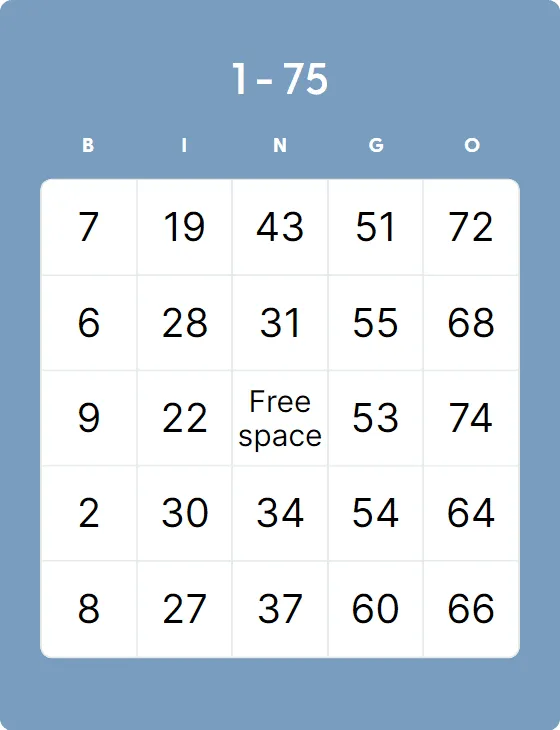 | 75-Ball Bingo | 75 | 5x5 grid (24 numbers + 1 free space) | Horizontal, vertical, diagonal, 4 corners, full card |